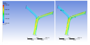 Streamline fluid flow has been shown in figure 3. As the viscosity of the fluids blood and anticoagulant is different at both inlets, the velocity at with which the fluid flow at both inlets is extremely different which can be seen in figure 3. As the blood flow is quite high as compare to the anti-coagulant, the velocity at the inlet where the blood enter is high as compare to the inlet from where the anti-coagulant enters. The velocity at the inlet with blood is 5.118 ms-1 and at the inlet with anticoagulant is 1.279 ms-1 as shown in figure 3.