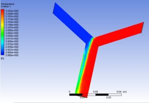 The temperature contour is shown in figure 6. The temperature of the blood through inlet 1 is maximum before mixing having a value of 325K and the anticoagulant from inlet 2 have a temperature of 290K. Figure 6 clearly shows at the conjunction of outlet and inlet, the temperature of both the inlet fluid merges and a shift in temperature has been observed in the outlet. This shows that the addition of anticoagulant will significantly reduce the temperature of the blood.
