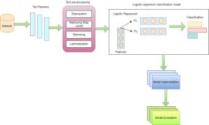 The logistic regression model is used for predictive analysis. The classes present in the dataset are analyzed and classified from the corpus used in the method. The model is tested and evaluated on the dataset, and the results are displayed after testing on multiple classes in the dataset. Logistic regression is mathematically defined in Eq. (1).