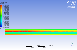 The pipe displays an initial velocity of 0.233 m/s at an initial temperature of 290 K. The results for the pipe are also computed using ANSYS Fluid Flow software to verify our simulation findings. We have calculated the temperature and velocity within the pipe as a result, and we have compared those numbers to information that has already been published. According to ANSYS Fluent, the pipe in this study has a temperature and velocity of 3.78×10-1 m/s and 2.98×102 K, respectively. In the simulation, nanofluids are introduced into the pipe at an intake velocity, processed inside the pipe wall, and their temperatures are measured at the pipe’s exit (outlet). In particular, the connection between temperature and pipe velocity is inverse. It’s important to emphasize how well the simulation findings match those established calculations. Using ANSYS simulation software, the previous researchers kadhum Audaa Jehhef et al. (2019 J. Prakash Arul Jose et al. (2023), and M Ibrahim et al. (2021) discovered the temperature and velocity results of 2.8×101 K and 2.6×10-2 m/s , 3.2×10-2 K and 2.38 m/s, and 3.05×101 Pa and 3.93 m/s, respectively. Results for temperature and velocity are 2.98×102 K and 3.78×10-1 m/s, respectively, in this paper.