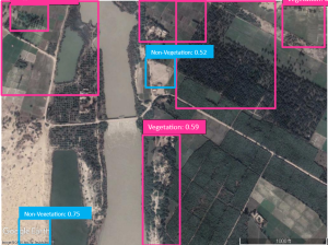 The YOLOR model’s mAP score is 0.54 on vegetation classes and 0.53 on Non-vegetation classes, as detailed in Table 4, signifies a moderate level of performance across both classes. The evaluation indicates that the YOLOR model excels in identifying and classifying objects within both natural and man-made environments. However, there is a notable challenge in detecting objects within land cover classes.