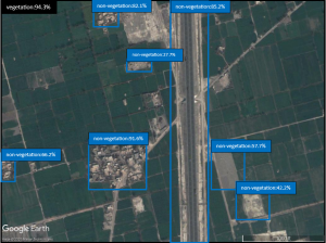 To train any deep learning model one of the important criteria is to create a dataset for training and testing as the dataset plays a vital role in training the convolution neural network. To work with land cover detection, land cover images were captured at the altitude of 1000 feet from Google Earth Pro. These images were taken from different cities in all provinces of Pakistan. A total of 450 images were taken from Google Earth Pro. All captured images were uploaded to Roboflow and each image was annotated one by one. There are a total of two (02) classes named as vegetation and non-vegetation. Each land use or land cover is mapped to vegetation if it is Cropland, Orchard, Forest, Rangeland, etc., similarly River, Highway, Residential, Industry, etc. are mapped to non-vegetation. Images were resized to 640 x 640 pixels for model training and testing. The dataset was split into training, validation, and testing sets, as these splits are frequently used in the field of object detection which allows straightforward division of the dataset and it is suitable for scenarios where you have a substantial amount of data and to assess the model’s generalization performance on unseen data. From the total of 450 images, 315 (70 percent) images were selected for training, 90 (20 percent) images were selected for validation, and 45 (10 percent) images for testing. Furthermore, different types of augmentation were applied to the training set to increase the number of training dataset. The dataset was transformed in XML and TXT format such that it can be used easily for model building purposes.