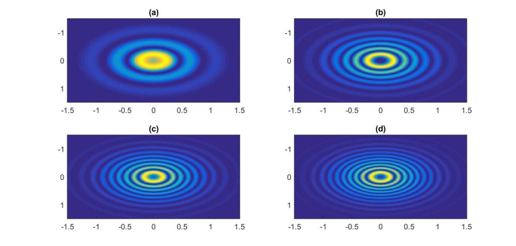 Figure II: The Newton rings using Eq. (1). We take, d = 100 a.u. L = 1000 a. u. and the value of E taken as (a) E=1eV, (b) E=2eV, (c) E=3eV, (d) E=4eV.