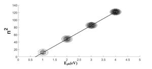There is a linear relationship between the square of the number of rings and the energy of the photons. If we extend the line backwards to the zero of the vertical-axis the value of electron affinity of is 0.754 eV which is nearly equal to the experimental value [21].