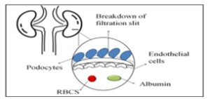Fig. I: Representation of Nephrotic syndrome (The human kidney is consisted of various layers and glomerular filtration barrier; the outer layer is epithelial layer made up of podocytes which encompassed the inner layer of endothelial cells. The red blood cells (RBCS) and albumin proteins are present under the layer of endothelial cells. The breakdown of the filtration slit bridged between podocytes causes the leakage of protein and red blood cells in urine leading to nephrotic syndrome.)