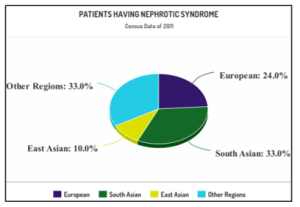Fig. III: Incidence of Nephrotic Syndrome among children of largest ethnic groups (The statistics reported that a higher percentage; 33% of South Asian children has incidence of nephrotic syndrome while European children has 24% incidence, East Asians has 10% chances while children of other regions collectively also have 33% chances of suffering from nephrotic syndrome)