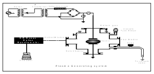 Helium gas was utilized for plasma region. With 100 Hz pulsing DC- power in a parallel plate configuration of electrodes whose diameter is 9.5 cm and spacing in between them is 3.0 cm. These electrodes were arranged in a parallel plate configuration. Electrical power is applied to the top electrode through the inductive load, which limits the current during the discharge. Prior to admitting the helium gas, the chamber is evacuated. Optical emission spectroscopy is carried out using a computer-controlled system comprising an Ocean optics spectrometer model HR 4000. The system is calibrated using a He-Ar lamp. The emission spectra (300-900 nm) are recorded as a function of electrical power (25-150 watt), filling pressure (0.5-1.5 mbar) and inter-electrode spacing (3-5 cm). The emission spectra was recorded at a filling pressure 1 mbar, with power of 100 watt and 4 cm inter- electrode spacing. Two of the ports serve as view windows or optical windows. These view windows are used to monitor the status of the discharge whereas optical window allows transmission of the light emanating from the glow discharge source to the interior of the spectrometer for spectroscopic analysis. One of ports is closed with the steel disc of thickness 1 cm having three small holes in vertical lines each of 1 cm diameter.