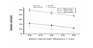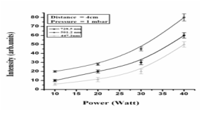 As a result of ionization process, ions that are accelerated due to the stronger electric field strikes the cathode with sufficient energy to cause the emission of the secondary electrons from it, which are also responsible for more excitation and ionization and as a result there is an increase in intensity of the species [12]. If we change power ranging from 10 watt up to 40 watt, we found that there is a change in intensity whose value varies from 10 to 60 a.u for the wavelength of 447.2, 501.28 & 728.23 nm with distance of 4.0 cm between the electrodes.