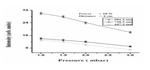 Fig. III: Graph between pressure of the gas and intensity of the active species, for the wavelength of 447.2, 501.2 and 728.5 nm.