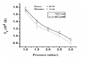 Here we give explanation about the electron temperature with different parameters like, with different pressure, powers and distances. We draw graph between different pressure and electron temperature to see the effect of pressure on electron temperature. Graph has been drawn for the wavelength of λ=728.5, 501.2 and 447.2 nm with the distance of 4 cm between the electrodes starting from pressure of 1.0 mbar up to 3.0 mbar. The graph is given below.