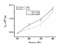 Similarly, electron temperature increases by increasing the power. It is due to increase of the excitation and ionization processes take place in the helium species. Due to bombardment of the ions on the cathode, secondary electrons are produced which increase the electron temperature. The electron temperature increases from .8 to 2 ev by increasing power source from (10- 40 watt) with filling pressure of 1 mbar and with 4.00 cm inter – electrode distance. Hence it is concluded that plasma discharge parameters can be used to optimize the generation of the active species of helium for material processing.