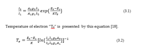 In optical emission spectroscopy, we need to determine the electron temperature and density in plasma in order to understand the features of atoms and molecules. During this process, a small fraction of these species are promoted to an upper electronic state through electron impact excitation. These species then decay and emit a photon with a specific wavelength, which may be detected and evaluated by recording the emission spectrum. The fundamental principle of this approach is that the emission intensity of a specific wavelength from an excited state is directly related to the concentration of species in that excited state. The relative intensities of this emission provide information on the concentration of the species. The Coronal model can be used for optical emission in low electron density plasma (ne<1011 cm-3). [15, 16]. As a result, in this scenario, species are activated only by the impact of electrons and decay radioactively rather than colliding with electrons. The ratio of these emission lines is thus temperature dependent for electrons. This formula gives the intensity ratio of two lines that belong to the same atomic species and have a shared lower state.[17].