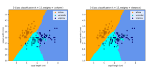Uniform weights are used in the basic nearest neighbor’s classification, which means that the value of a query point is decided by a simple majority of its closest neighbors. Weighing your neighbors might sometimes help ensure that people closest you can contribute most to the fit. This may be accomplished by using the weights keyword. While using the default weights = “uniform” configuration, each neighbor receives a uniform weight. As seen in Figure III, if you enter weights = “distance,” you will receive responses that are inversely proportionate to your distance from the query location. Alternatively, a function defined by the user of the distance might be used to calculate the weights.