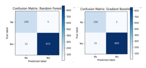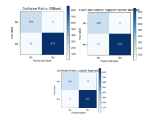 - Confusion Matrix: To visualize each classifier’s performance and comprehend the distribution of true positives, true negatives, false positives, and false negatives, confusion matrices were created for each classifier. This thorough examination aids in locating any biases or discrepancies in the models.