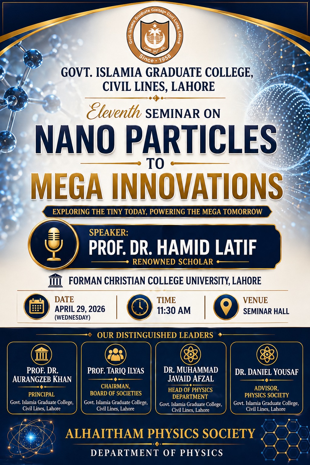 *Alhaitham Physics Society, Department of Physics, Govt. Islamia Graduate College, Civil Lines, Lahore* is pleased to announce its *Eleventh Seminar on “Nano Particles to Mega Innovations”* a seminar focused on how the smallest structures in science are driving some of the biggest transformations in technology, medicine, energy, materials, and the future of innovation.